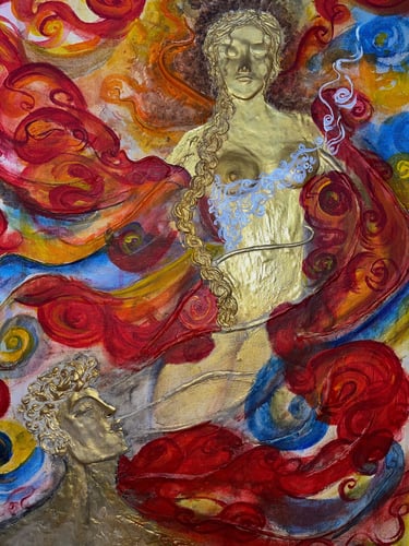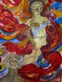 Medium: sculpted on canvas, acrylics, oils, 24k gold leafing