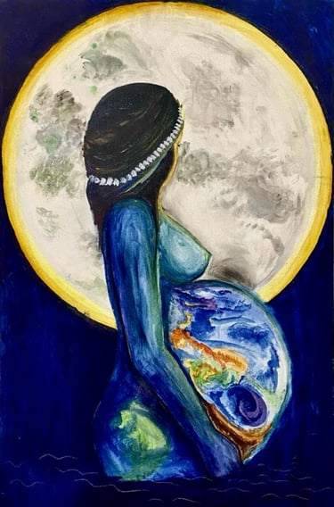This artwork represents a woman figure having the entire earth in her womb, to protect it from all the harm to come its way. having moon and water as her shrine embracing her femininity, colors announce the selflessness of a woman as she becomes a mother